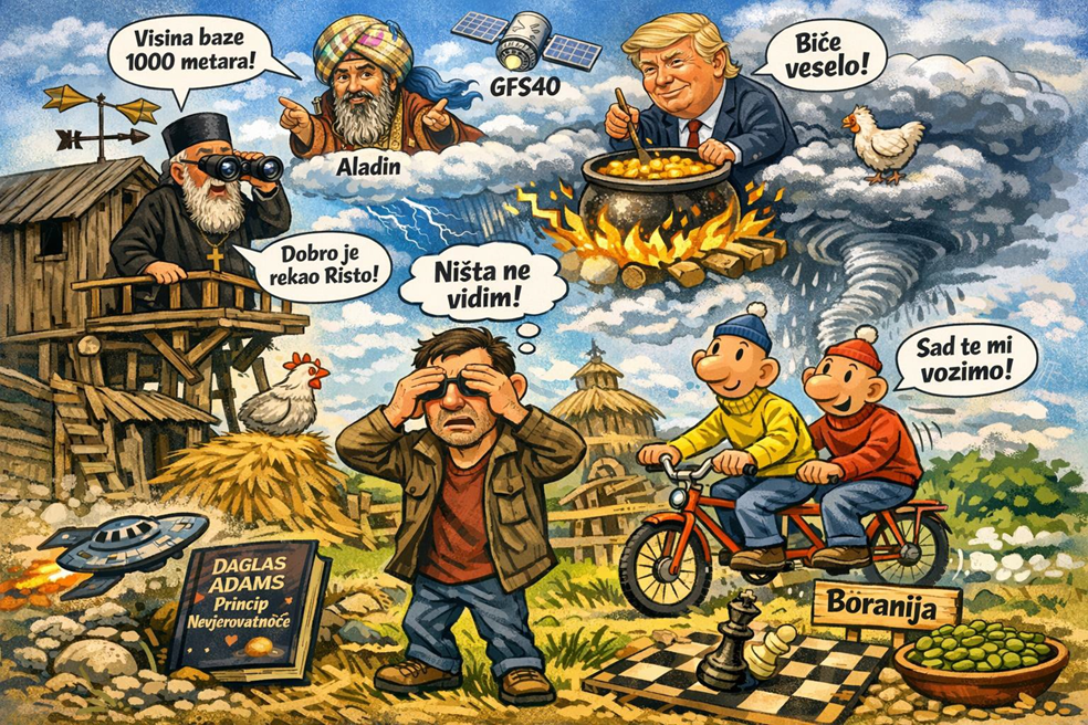 Treća greška je moja, i ovdje mogu da konstatujem postala je hronična, a to je što slušam Maksima koji mi kaže „dobro je rekao Risto kakav će dan biti!“. Pa valjda je više svima jasno da kad njih dva „preciziraju“ visinu baze to ti je isto kao da u ovoj našoj meteo zoni izmiješaš Aladin, GFS40 i Trampa, pa dobiješ… eto baš to dobiješ.
